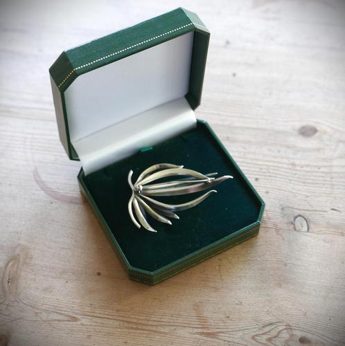 Norwegian Two Leaf Plum Enamel on Silver Brooch