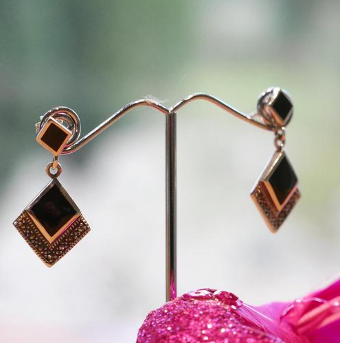 Art Deco Style Silver, Marcasite & Black Stone Drop Earrings