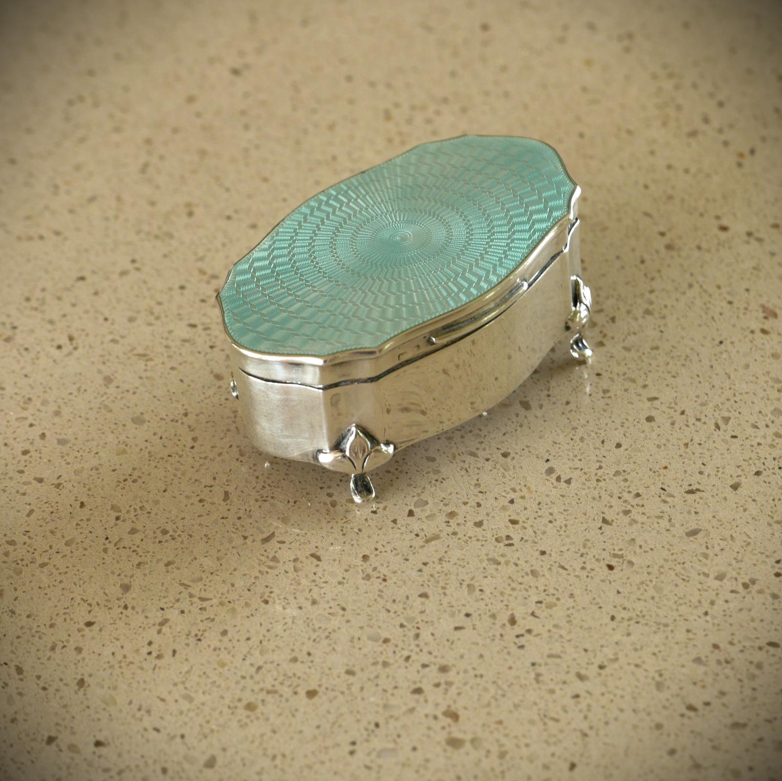 This exquisite ring or trinket box is solid hallmarked silver with a delightful eau de nil guilloche enamel lid. It was made by the very well respected factory of Henry Matthews and assayed in Birmingham in 1920. The interior is finished in silk and velvet, in complementary tones to that of the lid.