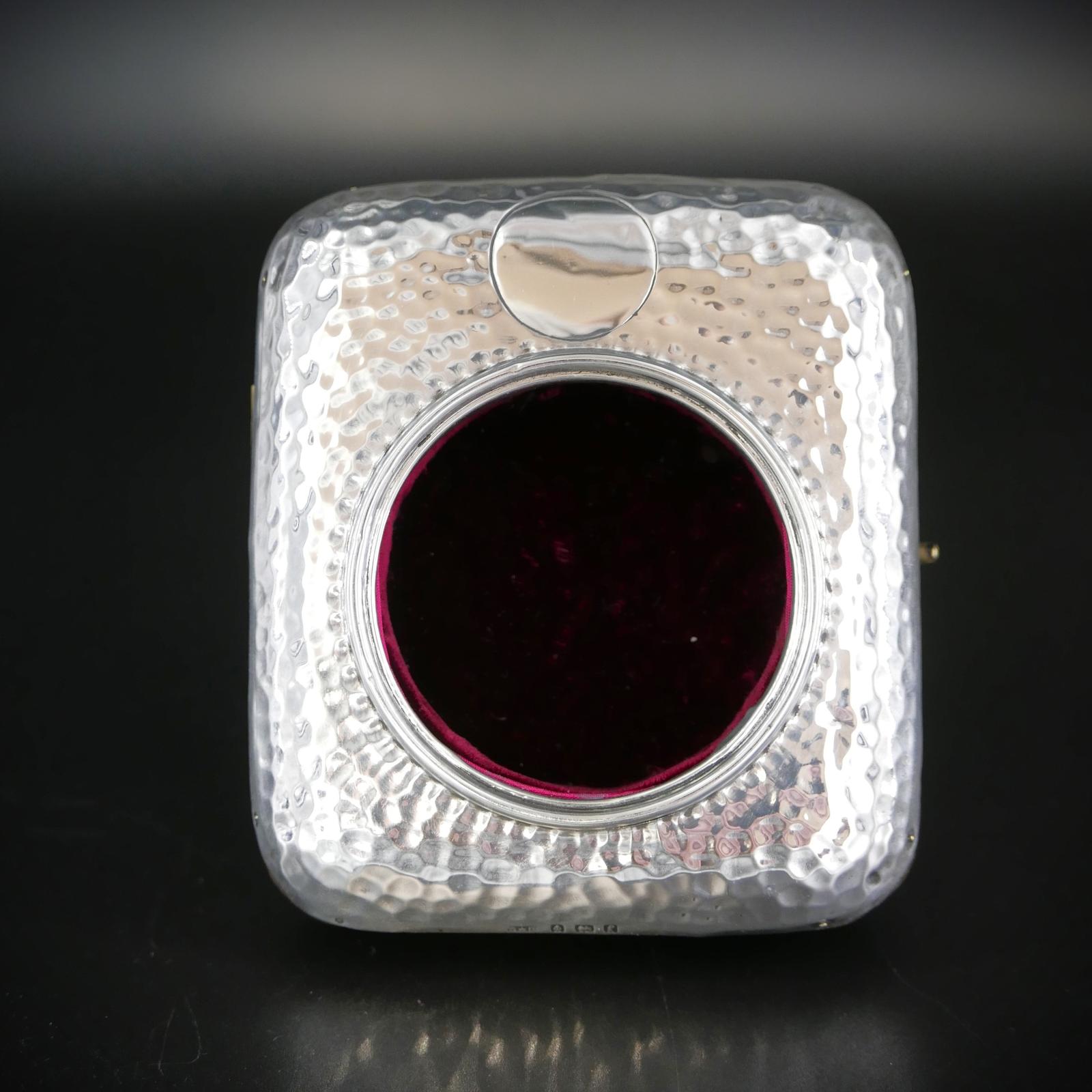 This delightfully planished silver mounted pocket watch stand dates from 1905 and comes from the accomplished Birmingham silversmith Synyer & Beddoes (Harry Synyer & Charles Joseph Beddoes). The watch support in the interior is finished in a deep red velvet with the inside of the hinged door is finished in a complimentary shade of silk. The silver is in good condition as the hinge and catch. The moroccan leather clad exterior is complete, but as you would expect does have patches of wear and tear from over 100 years of use. The hinged easel stand is complete and functioning, but similarly bears signs of over 100 years of use.
