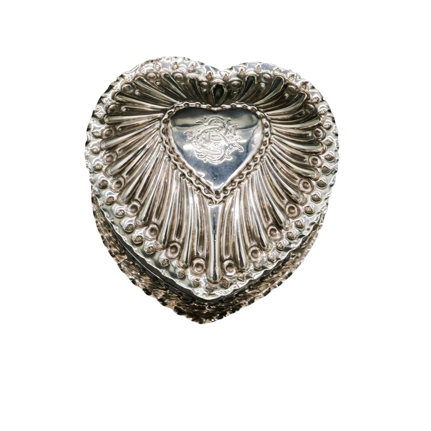 This beautiful heavy gauge silver heart shaped box is made by the world-renowned silversmith William Comyns & Sons.