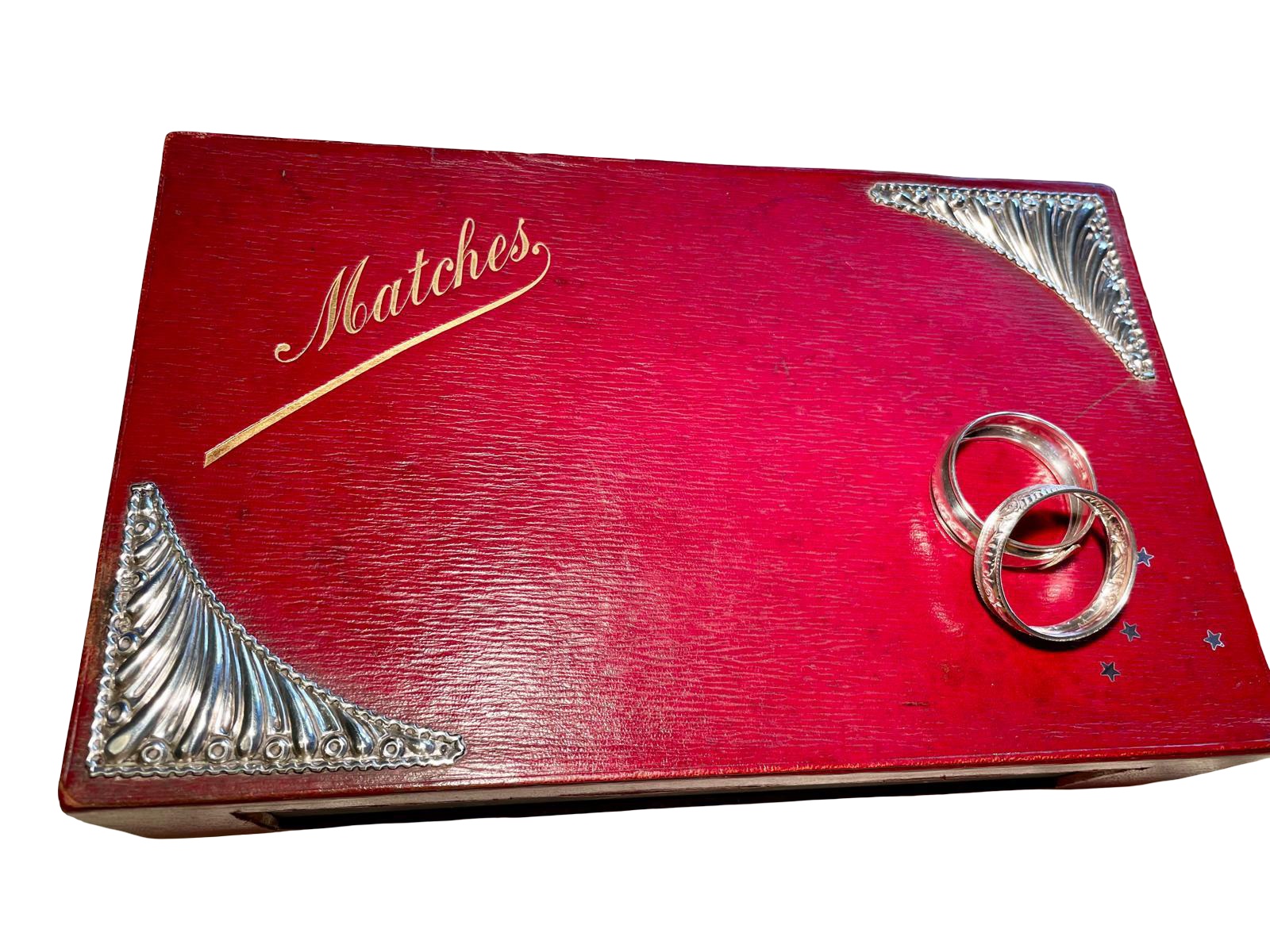 This is a large, very rare 19th century antique William Comyns, club or hotel bar matchbox in red Morocco leather, finished with two typically flamboyant corner embellishments from this world-renowned silversmith. Great for keeping those special memories in!