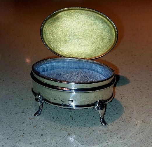 Good antique condition with some surface scratching, the odd dink and rubbed hallmarks. However, we hope that the charm of this piece in its refurbished blue silk will enable it to find a new home. Do make time to review all of the pictures to gain a full appreciation of the item and its condition. The underneath is covered with a black leather finish. Should you have any other questions in respect of either the item or its condition, please contact us and we will be pleased to assist wherever possible.