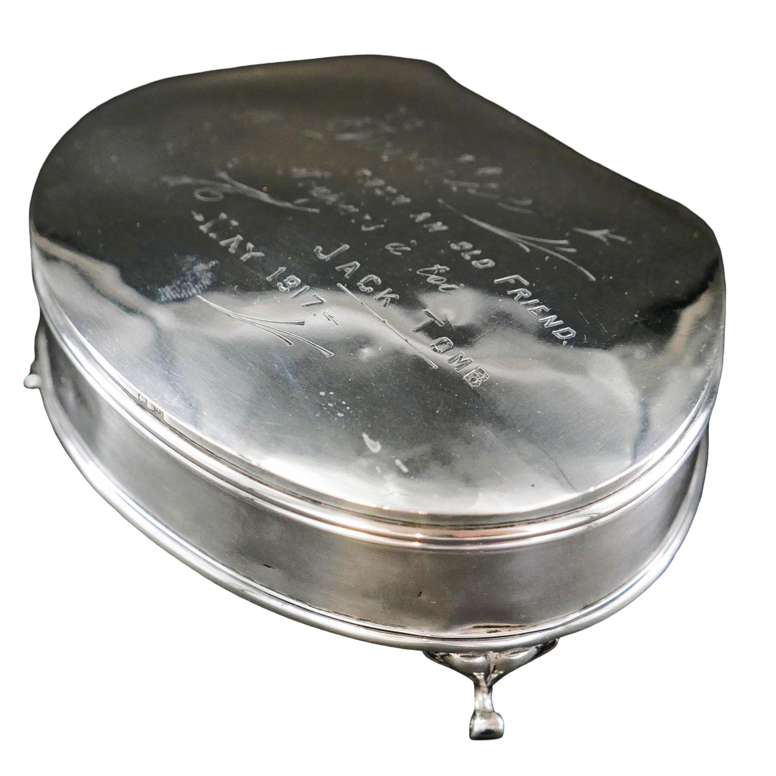 Romantic Great War, three Legged 'oyster Shape' silver trinket Box ...bears the delightful inscription "To Dollie from an old friend 'Toujours a toi' Jack Tomb May 1917".