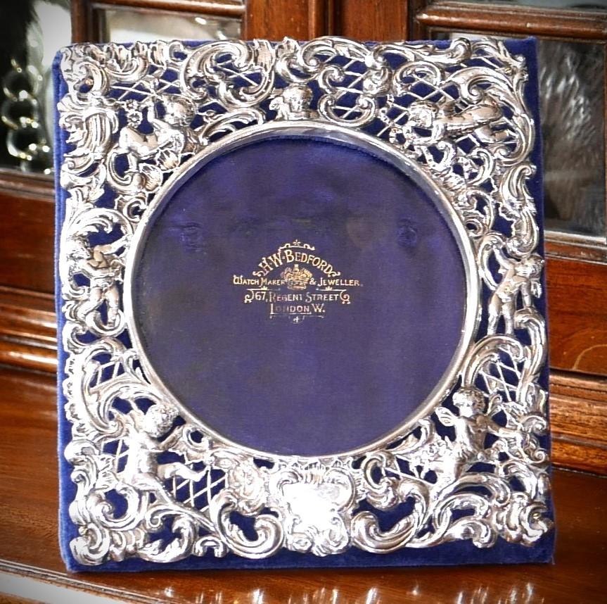 Rectangular in form with a circular window, putti or angel pierced border and velvet easel back. In very good condition.