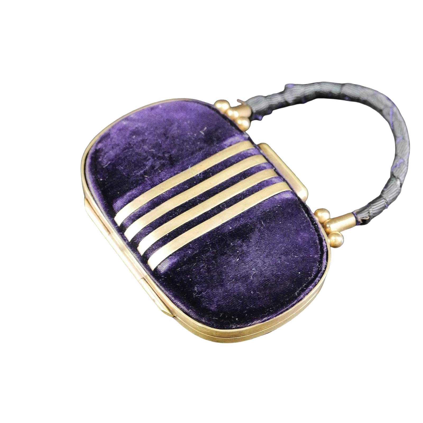 This stylish purse comprises a purple silk velvet outer, a matching silk lining, and brass frame. The outside of the purse features a four-bar design on either side, matching the rest of the metal work. The purse closes securely with a press catch. The purse is divided internally into three open compartments, and another secured with a hinge clip.
