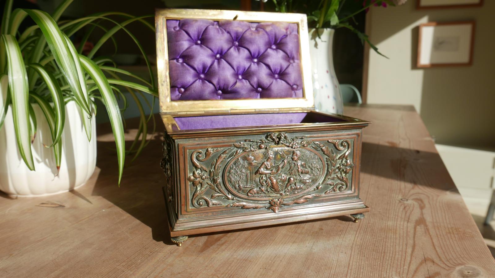 A high quality, luxury antique French gilt brass and gilt bronze jewellery casket, bearing the makers mark ..."T&E Paris" to the base.