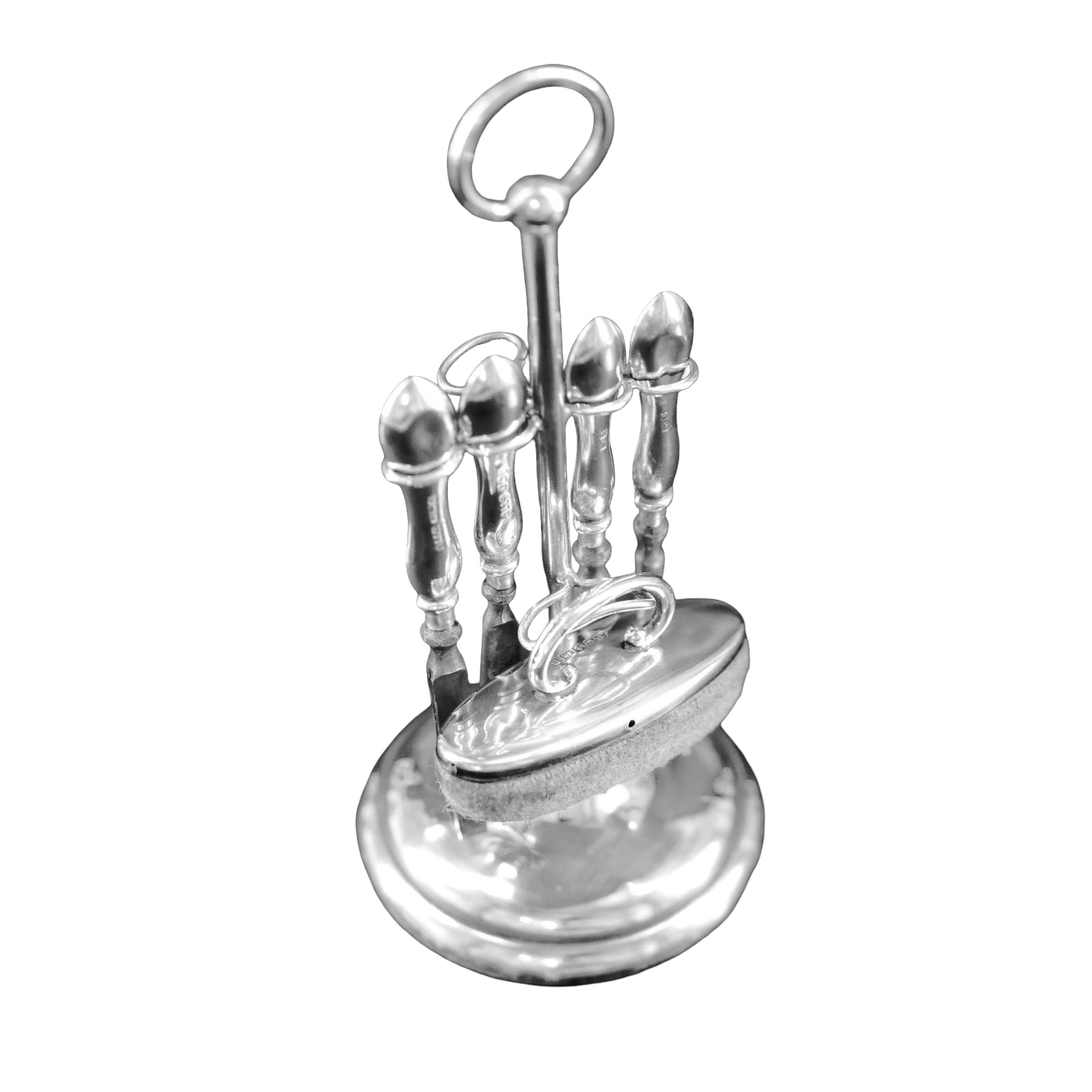 This children's manicure set is in remarkable condition for an item that is close to 125 years old. It does have obvious signs of age and use with dinks to the base of the stand and compressions to the top of a couple handles, probably as a result of an over enthusiastic child. Although there is a ring to the rear that originally probably contained a very small pair of scissors, one suspects this particular 'tool' was removed by parent to ensure the obvious dangers were avoided. Indeed whilst I have only ever seen two other sets like this, I have yet to see a miniature (childrens) set complete with scissors!