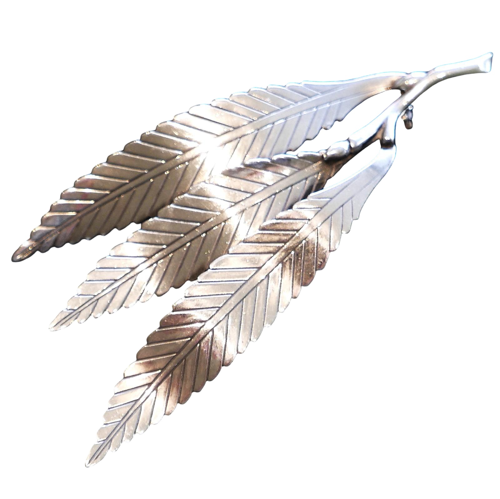 It is of a silver three leaf design, with a slight wave to the leaves profile. The rear of the brooch has a pin and C clasp closure. It is signed "AM", "Sterling Denmark" and Rougie.