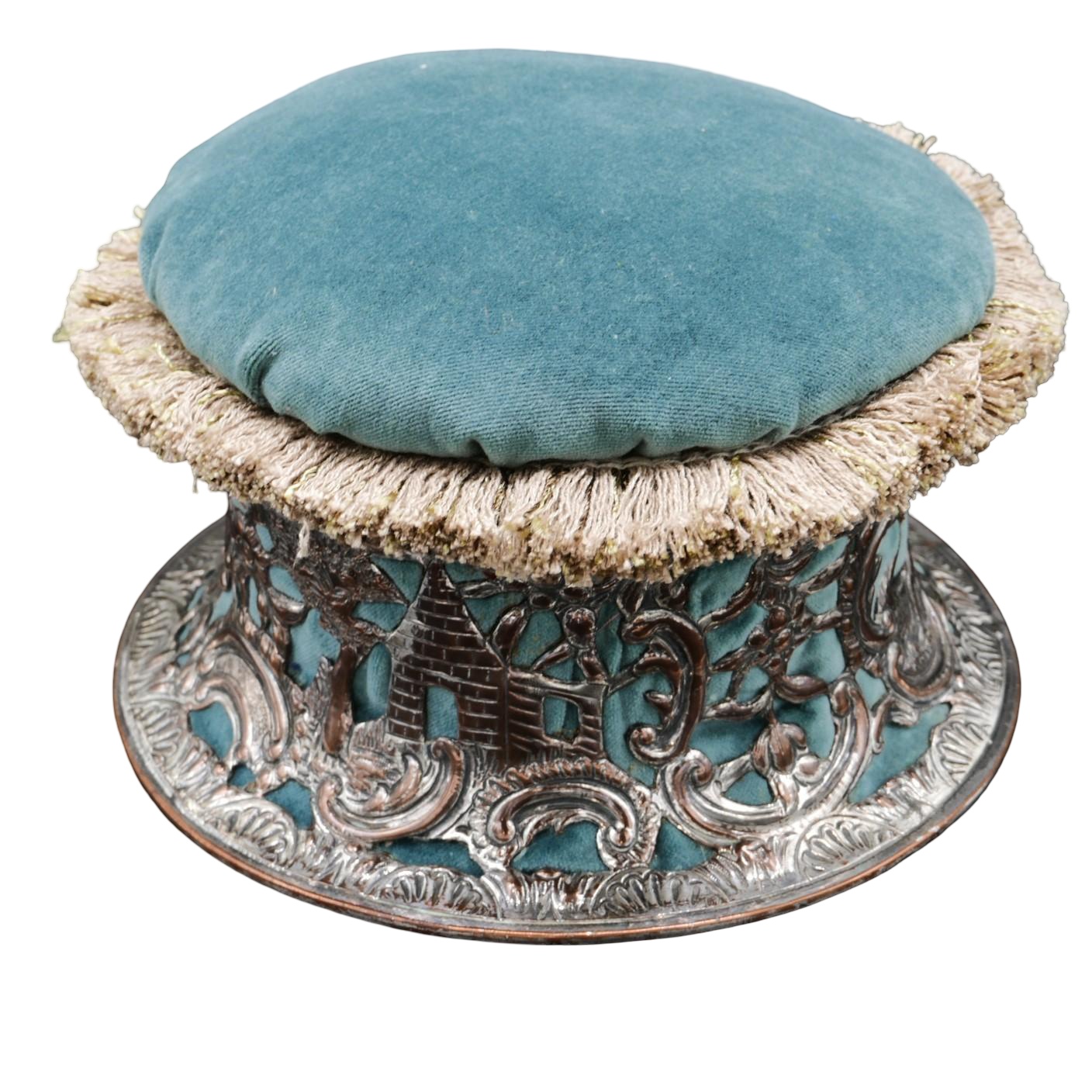 As you can see in the photographs, the Old Sheffield Plate waisted ring has been retained in its ‘as found’ condition, lined with a ruched and padded embroidered silk interior, backed onto a lovely hand dyed aqua velvet exterior. To finish the overall presentation of this regenerated antique, we have added a plug top in the same fabrics and padded the upper section with more of the velvet to provide a large pin-cushion / needle holder. Just in case you think the whole ensemble is understated, we added a light golden tone fringe to the circumference as a flourish.