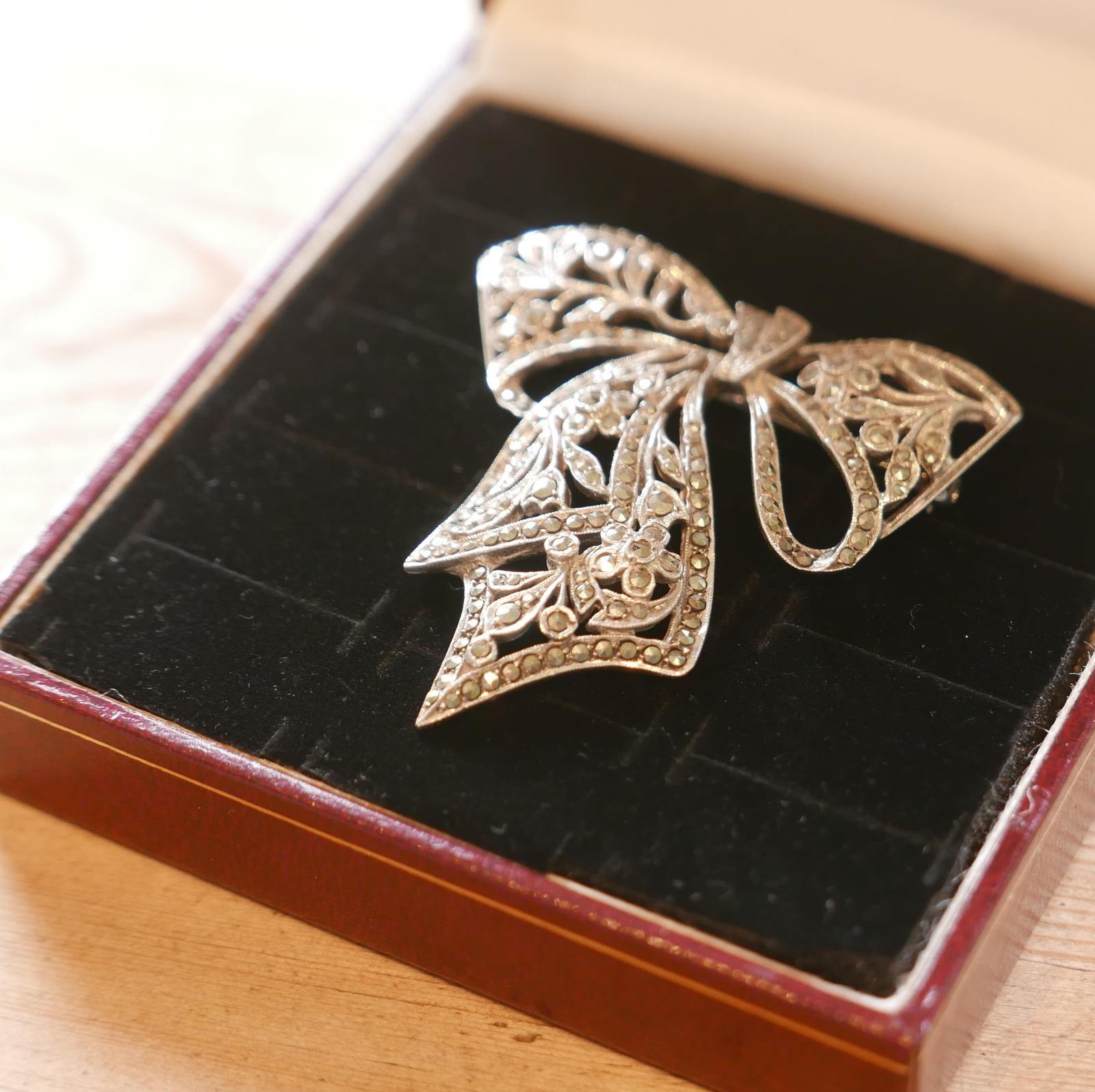 Here we present a heavy cast silver and marcasite triangular ribbon brooch, assayed in Birmingham in 1953. The piece carries full assay marks; [NBs] and an upper case H to the rear of one of the flowers.