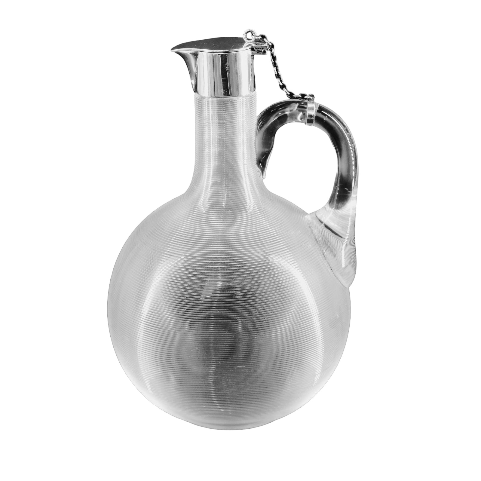 This is a delightful and extremely rare threaded glass decanter, benefiting from being in clear glass and surmounted by elegant Alexander Clark silver work.