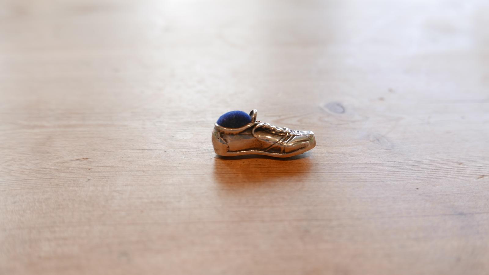 Here we have a delightful silver pin-cushion in the form of a modern football boot; assayed in London in 2002 the boot carries; the London assay mark, the import mark, the maker's identifier mark [AN] the Lion Passant , as well as; a FA stud pattern to the underside of the pincushion and a tongue at the lacing neck.