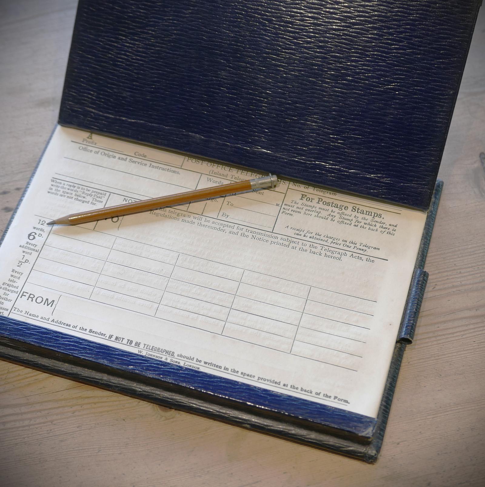 This item is an assayed silver mounted hotel 'Telegram Desk' complete with blank telegrams, dating approximately to 1908, with a London Hallmark, and we believe the maker to be W H Jackson & Son. It features a combination of silver, leather and other elements consisting the under-pinning wooden construction, designed specifically for the writing and handling of draft telegrams. The desk reflects the design and craftsmanship of the early 20th century, which would have been suitable for use in a hotel setting at the time. The silver mounts are indicative of the period's attention to detail in functional furniture and evocative of a bygone era.