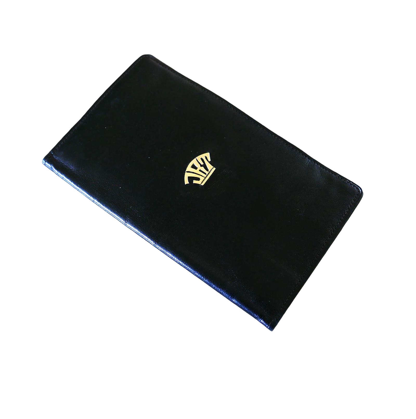 This vintage black leather wallet has a yellow metal monogram and a press button closure.