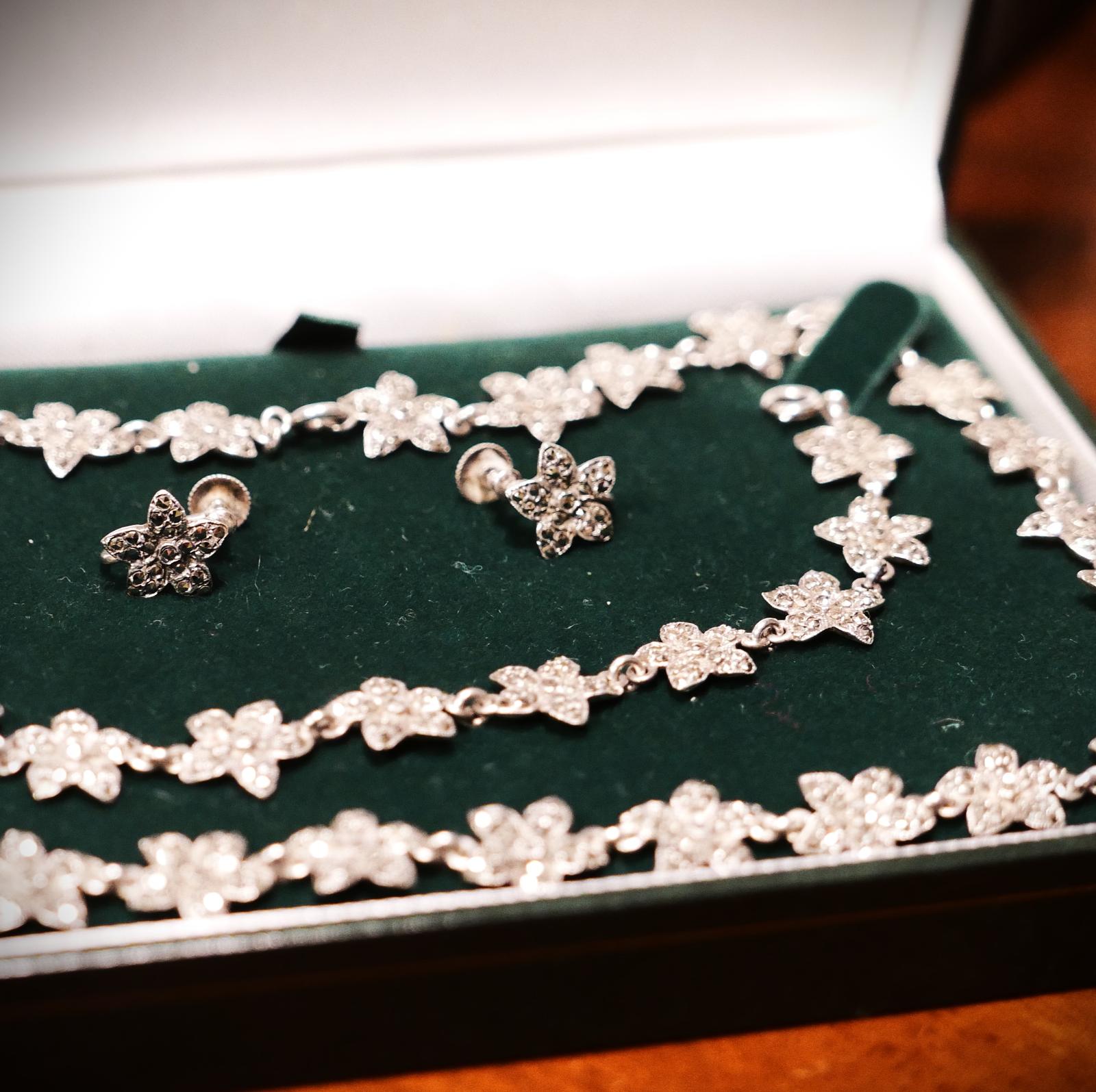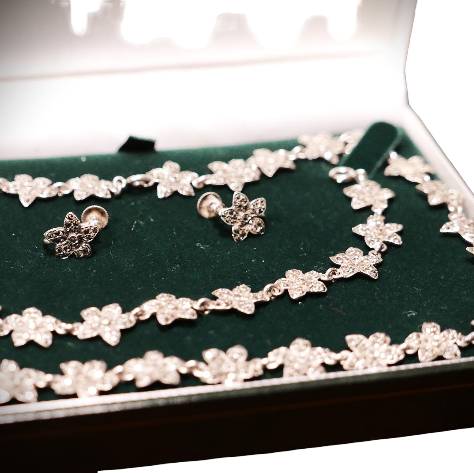 This suite of silver marcasite jewellery features a floral design and comprises a necklace, bracelet and a pair of earrings. The items are made from silver and date to the mid-20th century. The marcasites add detail to the floral motifs. Each piece reflects the design aesthetics of the mid-century period.